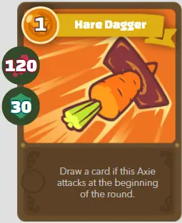| B | je ferai | Dague de lièvre | 1/120/30 | Piochez une carte si cet Axie attaque au début du tour |