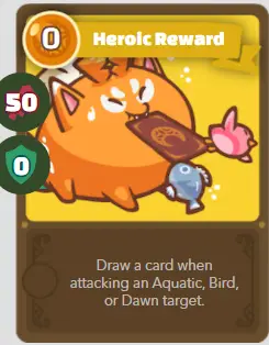 | ET | héros | Récompense héroïque | 60/0/0 | Piochez une carte en attaquant une cible aquatique, un oiseau ou une aube. |