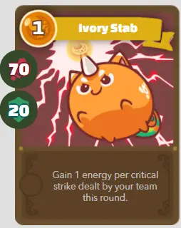 | À | Lutin | Coup d’ivoire | 1/70/20 | Gagnez 1 Énergie pour chaque coup critique que votre équipe réussit ce tour. |