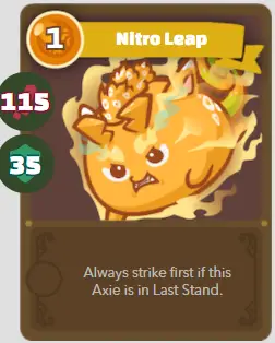 | B | Jaguar | Saut Nitro | 1/115/35 | Frappez toujours en premier si cet Axie est sur Last Stand. |
