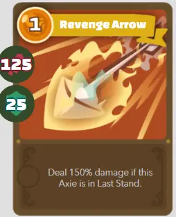 | B | Bête risquée | Flèche de vengeance | 1/125/25 | Inflige 150% de dégâts si cet Axie est en Last Stand. |