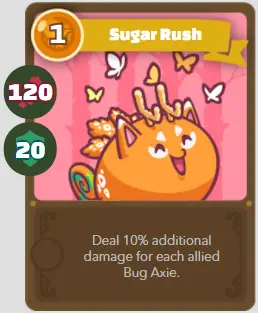 | ré | Pocky | Ruée vers le sucre | 1/125/20 | Inflige 10% de dégâts supplémentaires pour chaque bug Axie amical. |