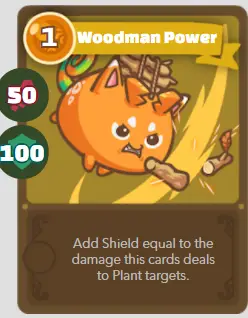 | ré | Charpente | Puissance de Woodman | 1/50/100 | Ajoutez un bouclier égal aux dégâts que cette carte inflige aux cibles de plantation. |