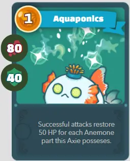 | B | Anémone | Aquaponie | 1/80/40 | Les attaques terminées restaurent 50 HP pour chaque partie d’anémone que possède cette Axie. |