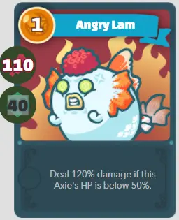 | S | Eux | Lam en colère | 1/110/40 | Inflige 120% de dégâts si la santé de cette Axie est inférieure à 50%. |