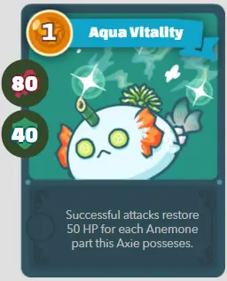 | B | Anémone | Aqua vitalité | 1/80/40 | Les attaques réussies restaurent 50 HP pour chaque partie d’anémone que possède cette Axie. |