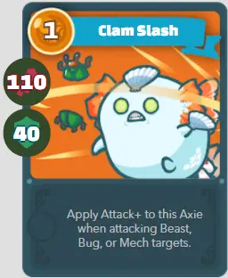 | B | Clapet | tranche de palourde | 1/110/40 | Appliquez Attack + à cette Axie lorsque vous attaquez des cartes Beast, Bug ou Mech. |