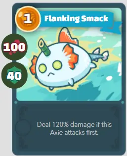 | B | Navaga | claquement de flanc | 1/100/40 | Inflige 120% de dégâts si cet Axie attaque en premier. |