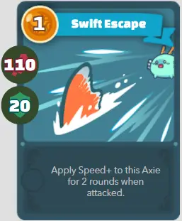 | S | Poisson rouge | Évasion rapide | 1/110/20 | Appliquez Vitesse + à cet Axie pendant 2 tours lorsqu’il est attaqué. |