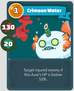 | À | Piranha | Eau cramoisie | 1/120/30 | Ciblez l’ennemi blessé si les PV de cet Axie sont inférieurs à 50 %. |
