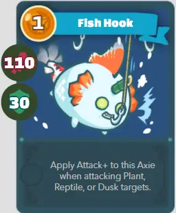 | À | Poisson risqué | Hameçon | 1/110/30 | Appliquez Attaque + à cette Axie lorsque vous attaquez des cibles Plante, Reptile ou Crépuscule |