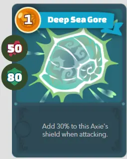| C | Coquille de sarcelle | Gore des grands fonds | 1/50/80 | Ajoutez 30% au bouclier de cette Axie lors de l’attaque. |