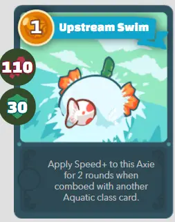 | B | Koi | Nager en amont | 1/110/30 | Appliquez Vitesse + à cet Axie pendant 2 tours lorsqu’il est combiné avec une autre carte Aquatique. |