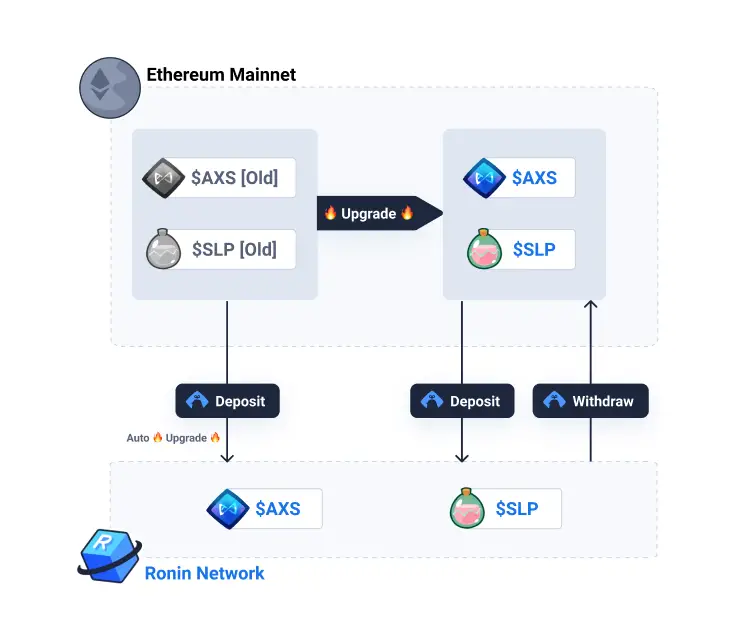 3. Déposez ETH, AXS et SLP à Ronin. SLP et AXS ont été mis à jour. * Vos anciens jetons seront automatiquement mis à jour lorsqu’un montant sera déposé dans Ronin. Par exemple, si vous avez 200 anciens AXS et que vous en déposez 100 dans Ronin, vous aurez maintenant 100 AXS mis à jour dans Ronin et 100 AXS mis à jour dans Ethereum.