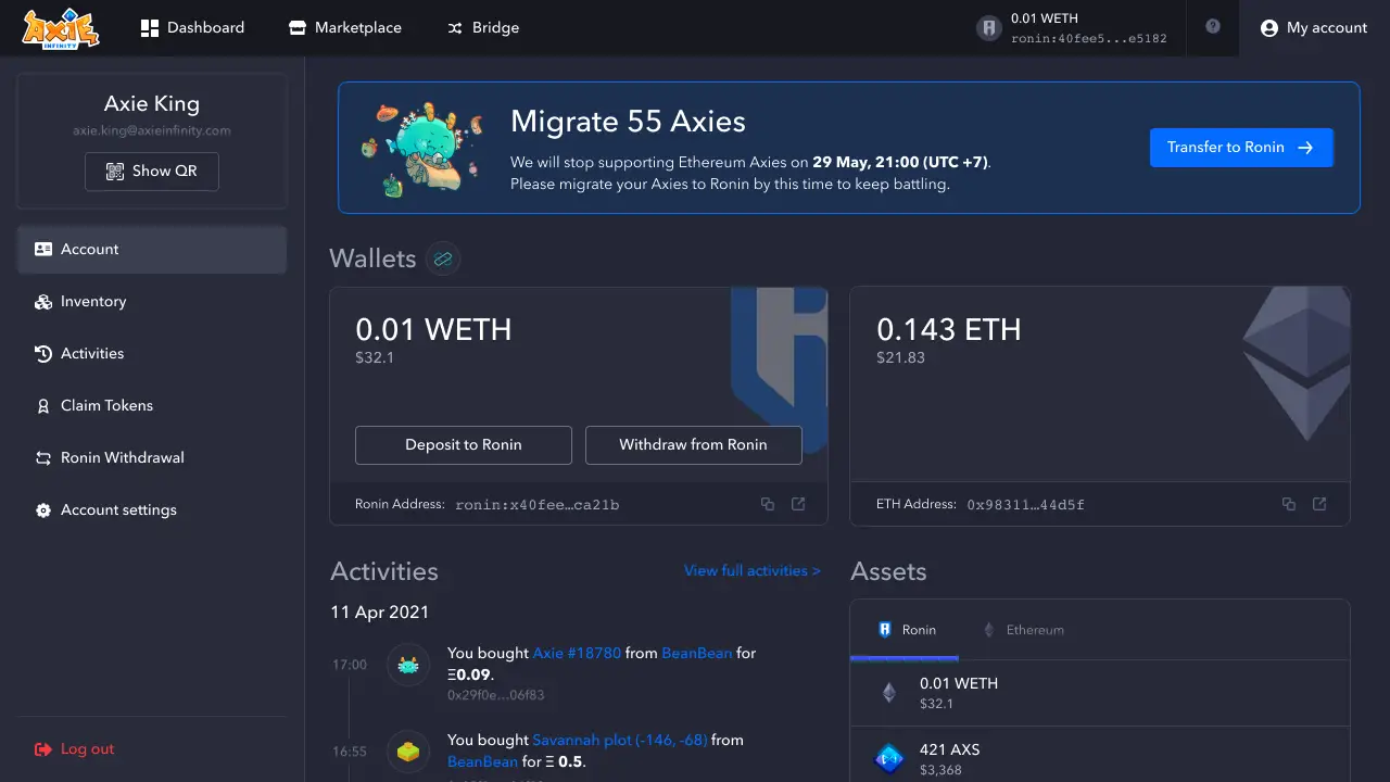 - Ronin Phase 2 est maintenant disponible! Vous pouvez maintenant migrer vos Axies vers Ronin pour une relecture, une réclamation de jeton et une expérience du marché en douceur !