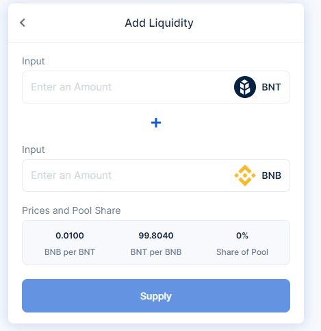 Lorsque les fournisseurs de liquidité déposent leurs jetons dans un pool de liquidité Bancor, ils reçoivent un jeton de pool, qui indique leur participation au pool. Pour entrer dans l’un de ces pools, BNT et un autre jeton, par exemple ADA, sont généralement utilisés. Cependant, il peut également y avoir des pools ADA/USDB, ce dernier étant un stablecoin adossé à la BNT. Pour cet exemple, un pool de jetons ADA/BNT sera généré et pourra être échangé contre le montant initial de l’ADA et du BNT plus les commissions générées.
