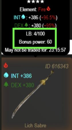 Les armes reforgées sont indiquées par leurs attributs LB, 4B ou 5B et une statistique de puissance bonus supplémentaire.