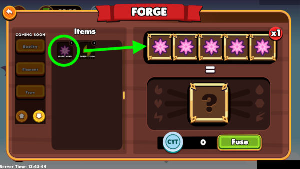 Une fois que vous avez collecté au moins cinq étincelles du même élément, vous pouvez les fusionner en allant dans Cave > Forge.