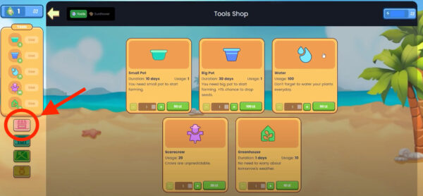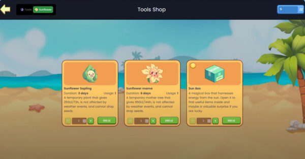 Pour acheter des graines de tournesol, rendez-vous dans l’onglet «Tournesol» à côté de «Outils» dans la boutique.