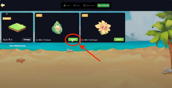 Tous les joueurs reçoivent des parcelles de terrain gratuites : 1 emplacement pour un arbre mère et 5 emplacements pour les plantes où vous pouvez planter des tournesols.