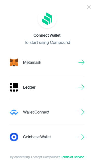La première chose que vous devez savoir si vous souhaitez utiliser Compound Finance est que vous n’avez pas besoin de créer un compte pour commencer, connectez simplement votre portefeuille de crypto-monnaie. Comme le projet est en développement constant, les portefeuilles disponibles peuvent changer, mais aujourd’hui, ils sont: