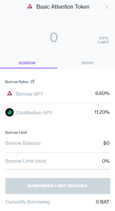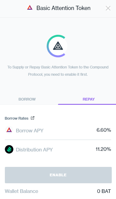 - Emprunter: L’une des caractéristiques les plus importantes de Compound Finance est la fonction Emprunter. Autrement dit, dans Compound, vous pouvez emprunter des actifs à la plate-forme(prendre un prêt), en créant une dette avec la plate-forme. Le montant que vous empruntez doit être inférieur à la liquidité du compte.