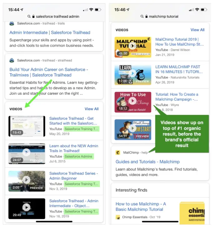 Pour que vous compreniez l’importance d’apparaître dans le carrousel vidéo Google. Sur les appareils mobiles, il occupe la quasi-totalité de l’écran pour la grande majorité des recherches.