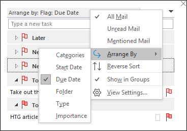 En revanche, l’option Tâches propose une tonne d’options personnalisables, agissant comme un dossier de courrier électronique ordinaire. Cela signifie que vous pouvez personnaliser cette option comme n’importe quel dossier. Par défaut, vos tâches sont organisées par date, par ordre croissant.