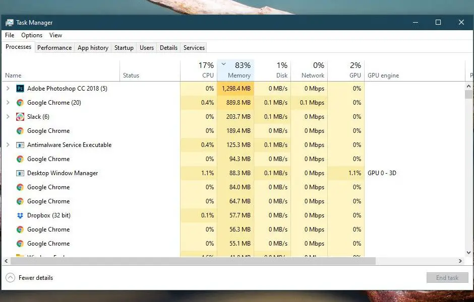 La première chose que vous devez faire est de vous assurer que rien d’inhabituel ne fonctionne sur votre système et ne consomme trop de mémoire. Un antivirus ou une application Chrome est susceptible d’utiliser beaucoup de RAM, mais s’il y a quelque chose que vous ne reconnaissez pas, découvrez ce que c’est. De même, si cela ne devrait pas être en cours d’exécution, fermez-le et supprimez-le de votre système s’il n’affecte pas votre flux de travail.