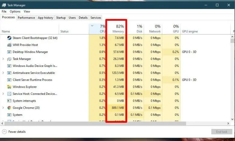 Ouvrez le gestionnaire de tâches et, dans l’onglet Processus, recherchez la colonne «Mémoire». Cette colonne rapporte l’utilisation de la RAM.