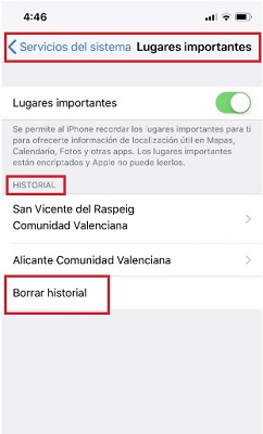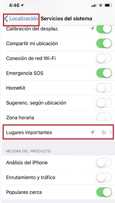 - Cet onglet vous montrera plusieurs options pour activer ou désactiver la fonction, vous sélectionnerez là où il est dit «Lieux importants» ou «Localisation fréquente».