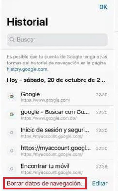- Dans le cas où nous voulons éliminer uniquement la recherche d’un site spécifique, il suffit que dans la section «Historique», nous effectuions un panoramique jusqu’à trouver celui que nous voulons éliminer, le sélectionnons et le glissons vers la droite.