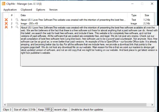 La fonction ou caractéristique qui différencie ClipMe du reste des visionneuses de presse-papiers gratuites est la grande capacité dont il dispose pour stocker les éléments copiés. Plus précisément, ClipMe peut stocker jusqu’à 1000 éléments dans le presse-papiers. De plus, il vous permet de voir le contenu du texte, de l’image, de la page Web copiée, de modifier une URL, etc.