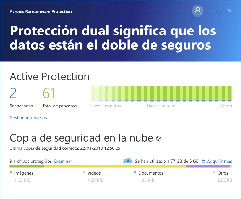 De plus, démontrant à nouveau le leadership d’Acronis dans le stockage et les sauvegardes, cette application nous permet également de profiter de 5 Go de stockage gratuit dans le cloud pour enregistrer des copies de sauvegarde de nos fichiers les plus importants.