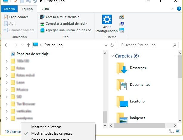 La première chose que nous devons faire est d’ouvrir un explorateur de fichiers, puis de cliquer sur une zone vide du panneau de navigation sur le côté gauche. Pour ce faire, il est préférable de faire défiler tout le chemin vers le bas et de cliquer sur la partie vide avec le bouton droit de la souris. Cela nous montrera trois options dans le menu contextuel, Afficher les bibliothèques, Afficher tous les dossiers et Développer vers le dossier actuel. A cette occasion, il faut cocher l’option Afficher tous les dossiers et vérifier comment automatiquement, dans le même panneau de navigation de l’explorateur de fichiers Windows 10, apparaîtra l’accès au Panneau de configuration.