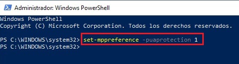 - Une fois cela fait, une fenêtre PowerShell bleue s’ouvrira , dans laquelle nous devons écrire la commande suivante et appuyer sur la touche de retour: Set-MpPreference –PUAprotection 1 . (écrivez exactement dans le texte affiché respectez l’espacement, et non espacé). Redémarrez le système pour profiter d’un système plus sécurisé.