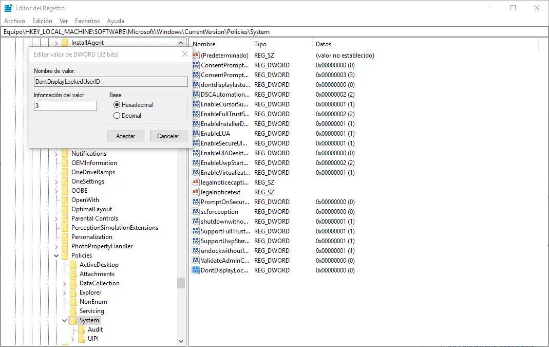 Une fois dans cette clé de registre, la première chose que nous ferons est de localiser une valeur, appelée «dontdisplaylastusername», et de l’ouvrir en double-cliquant dessus pour changer sa valeur de «0», qui est la valeur par défaut, à «1».