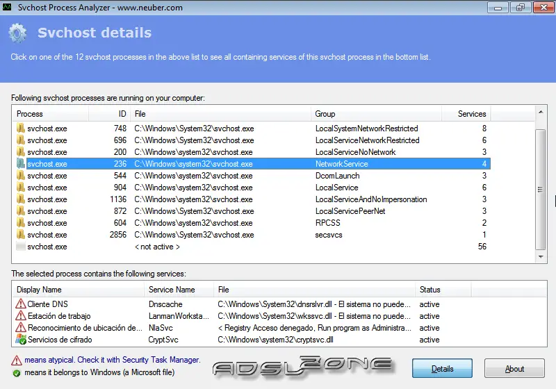 Avec Svchost Process Analyzer, ce problème est résolu, car il associe chaque processus svchost.exe au service qu’il exécute et nous donne des informations détaillées. De cette manière, nous pouvons identifier, en cas de problème ou de forte consommation de ressources, qui en est la cause. De plus, c’est un programme portable qui n’a pas besoin d’installation.