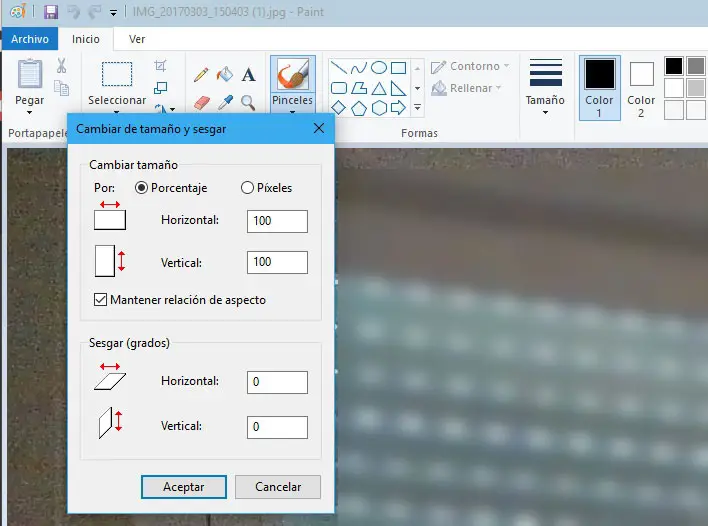 L’outil le plus utilisé par de nombreux utilisateurs est peut-être le fameux Paint , l’une des applications qui accompagne le système d’exploitation Microsoft depuis ses origines et qui permet de modifier facilement la taille d’une photo. Pour ce faire, ouvrez simplement l’image que nous voulons redimensionner avec Paint et une fois que cela est fait, nous devons aller dans l’option Fichier> Image> Redimensionner et incliner . Cela ouvrira une fenêtre dans laquelle nous pourrons indiquer si nous voulons changer la taille en pourcentage, en pixels, si nous voulons conserver les proportions ou non, etc.