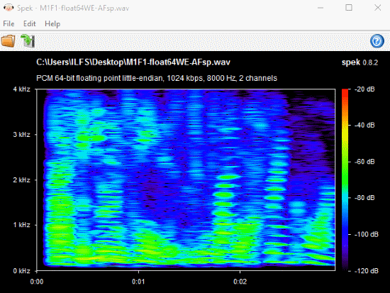 Contrairement aux outils précédents, Spek est une application qui, au lieu de nous informer sur la qualité d’un WAV, sert à voir le spectre acoustique d’un fichier audio. Nous pourrons connaître la plage de fréquences du fichier, ainsi que la plage de décibels. De cette façon, nous saurons si un fichier a subi des pertes de qualité ou non, en tenant compte du fait que les fichiers originaux ont une fréquence supérieure à 20 kHz.
