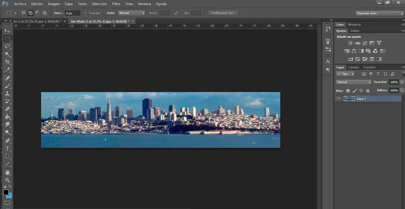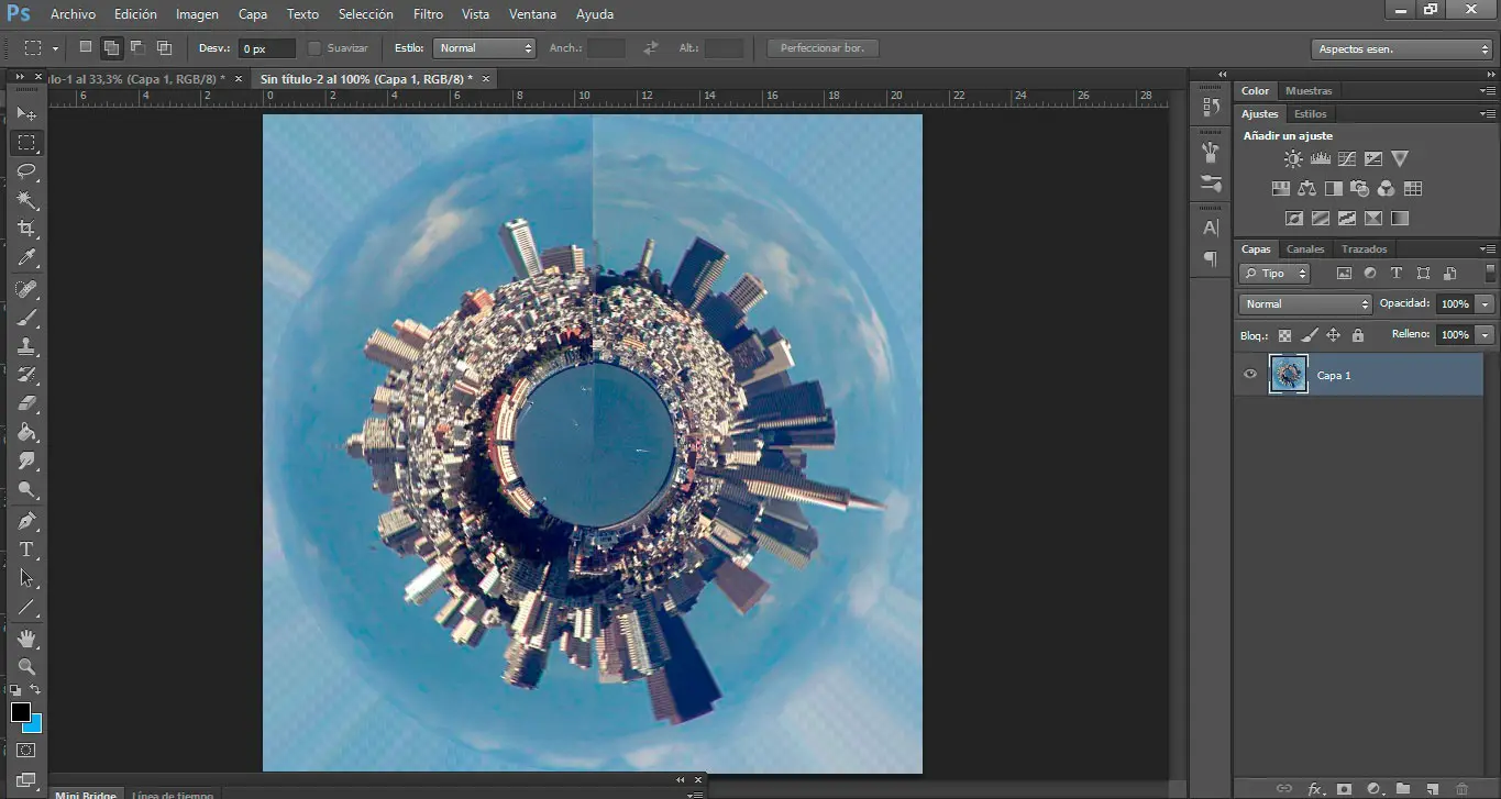 Une fois que cela est fait, nous joignons toutes les couches en une seule et nous sommes prêts à commencer à appliquer l’effet dessus et à le transformer en notre petite planète. Tout d’abord, il convient de prendre en compte que pour que le résultat soit optimal, l’image doit avoir un horizon bien défini, cette partie du ciel peut être vue par exemple, et que les deux côtés de l’image sont similaires ou au moins avec les mêmes tonalités et la même quantité de lumière afin que lors de la jonction, il soit aussi homogène que possible.