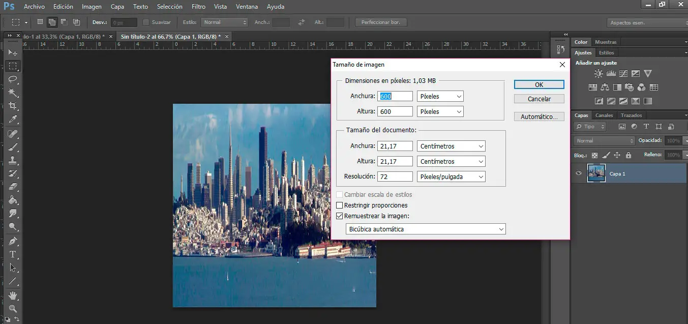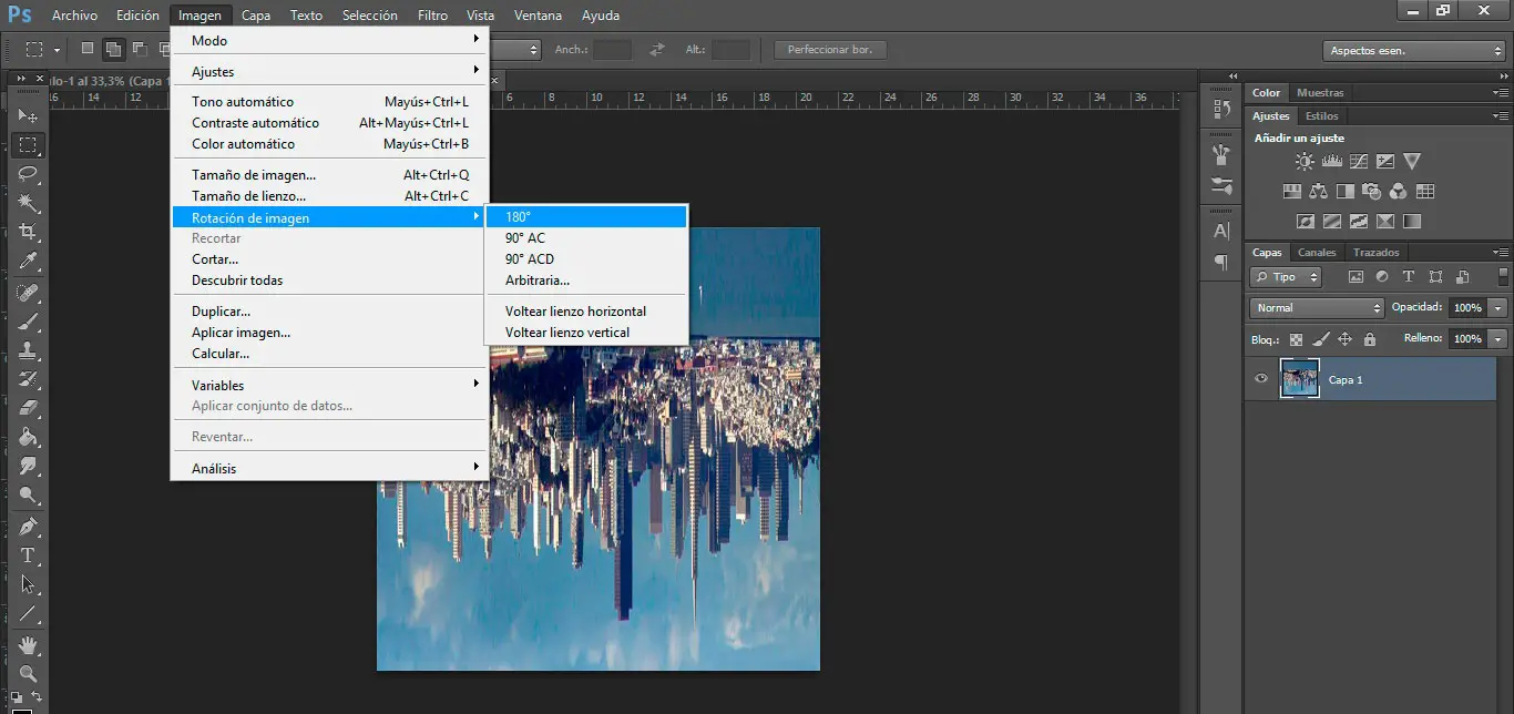 La première chose que nous allons faire est de donner à notre image un format carré en changeant sa taille. Pour ce faire, nous allons dans l’option de menu Image> Taille de l’image et en supprimant les restrictions de proportions, nous donnons la même largeur que quelque chose à l’image. Une fois cela fait, nous le faisons pivoter de 180 degrés à partir de l’option Image> Rotation de l’image> 180 degrés et enfin, nous n’avons plus qu’à appliquer un filtre, qui sera celui qui effectuera l’effet et créera notre Petite Planète.