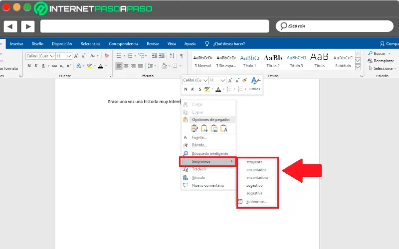 Dans le cas de Word, il existe une très bonne astuce qui vous aidera à obtenir les synonymes nécessaires pour que vous puissiez faire un texte très professionnel . Pour ce faire, il vous suffit de placer le curseur sur le mot que vous voulez et de faire un clic droit, il apparaîtra plusieurs options où nous sélectionnerons «Synonymes», il y aura différents mots où vous choisirez le plus adapté à votre texte.