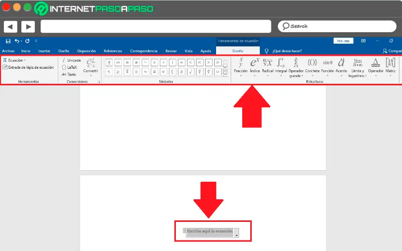 Pour ce faire, vous devez cliquer sur l’option Que voulez-vous faire? Et là, vous écrivez «Equation», puis vous verrez l’option «Insérer une équation» que nous sélectionnons. Enfin une fenêtre apparaît avec les équations fournies par défaut , ainsi que la possibilité d’ écrire les vôtres .