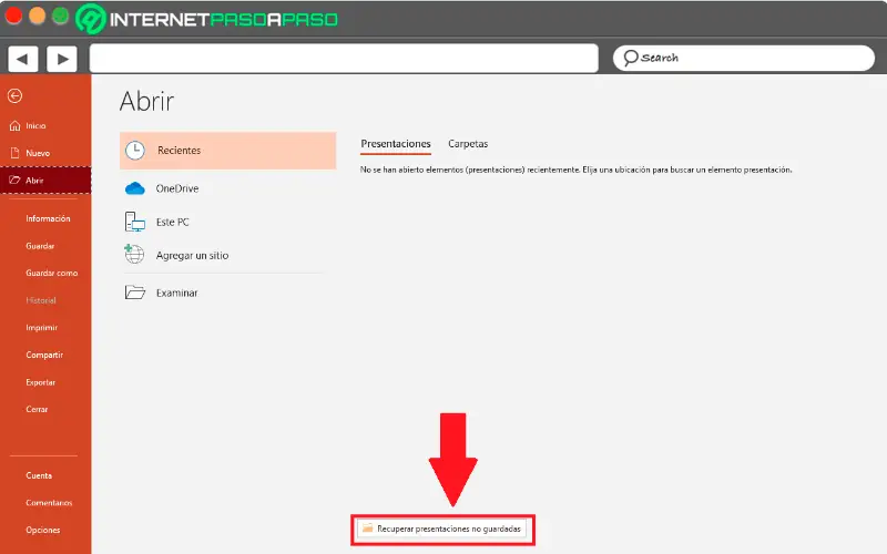 Par conséquent, grâce à cet outil, vous avez la possibilité de récupérer votre fichier et de continuer à travailler dessus. Pour ce faire, vous devez ouvrir PowerPoint et aller dans «Fichier» > «Ouvrir». Là, vous verrez une option pour «Récupérer les présentations non enregistrées», nous la sélectionnons puis nous choisissons la présentation que nous voulons récupérer.