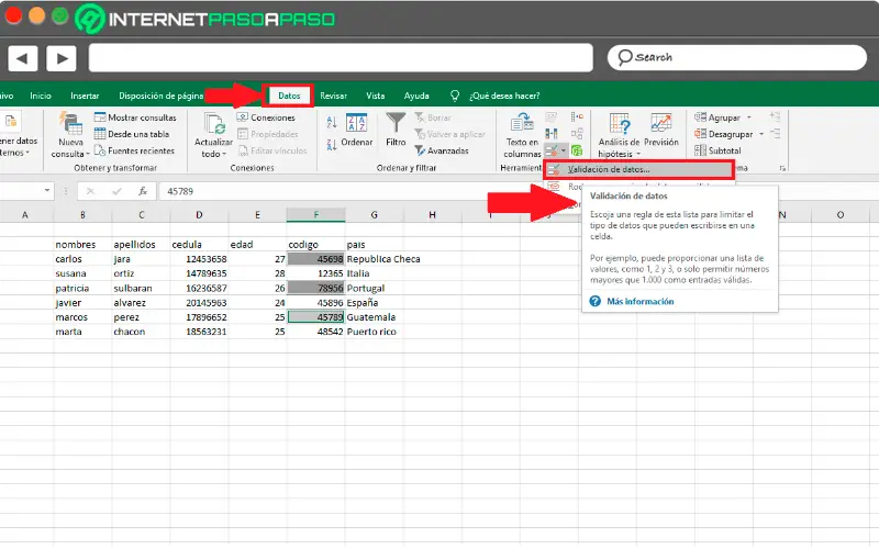 Pour utiliser cette propriété, l’utilisateur doit sélectionner les cellules auxquelles il souhaite appliquer cette restriction . Une fois sélectionné, ce qui suit sera d’entrer dans l’onglet «Données», là nous sélectionnons l’option «Validation des données». En sélectionnant cet outil, nous pouvons commencer à définir les restrictions dans chacune des cellules précédemment sélectionnées.