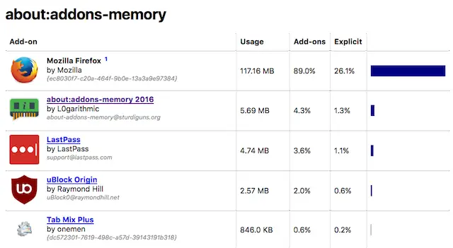 Eh bien, il existe un add-on pour Firefox, à propos de: addons-memory , qui vous permet de connaître la quantité de mémoire que chaque plugin ou extension installé dans le navigateur consomme pour savoir si une certaine extension ou add-on cause le navigateur pour ralentir et nous devons donc le désinstaller ou le remplacer.