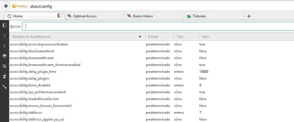 Par conséquent, à partir d’une fenêtre de navigateur, nous écrivons about: config dans la barre d’adresse et appuyez sur Entrée. Cela nous donnera accès à la liste des préférences du navigateur où nous devons rechercher une série d’entrées pour établir les valeurs que nous allons voir ci-dessous: