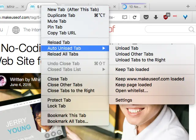 D’une part, nous avons Auto Unload Tab , un outil qui nous permettra de savoir si un onglet fait un bon usage de notre CPU ou de la mémoire RAM, en pouvant l’arrêter à tout moment ou même définir le nombre maximum d’onglets que nous peut s’ouvrir à chaque session. En cliquant simplement sur l’onglet, le menu contextuel s’affichera avec toutes les options offertes par cet add-on.