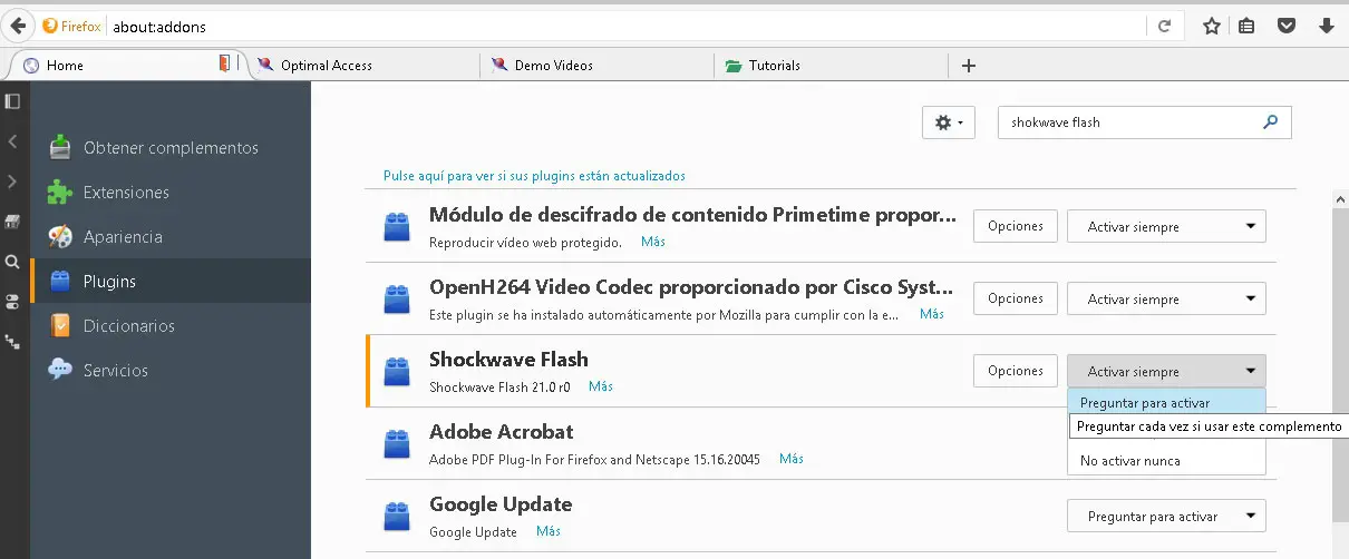 Si nous voulons qu’il ne charge pas de contenu Flash mais qu’à certaines occasions, nous pouvons activer le plugin depuis un site pour regarder une vidéo, nous devons sélectionner l’option Demander à activer.